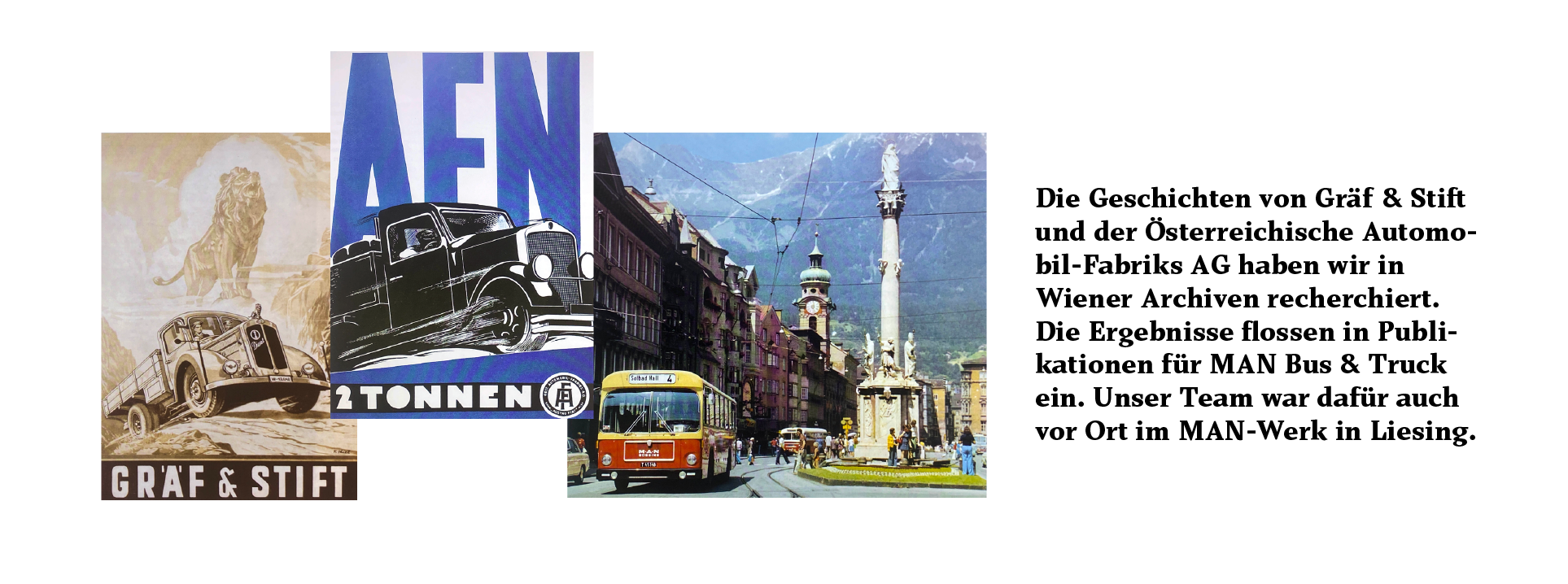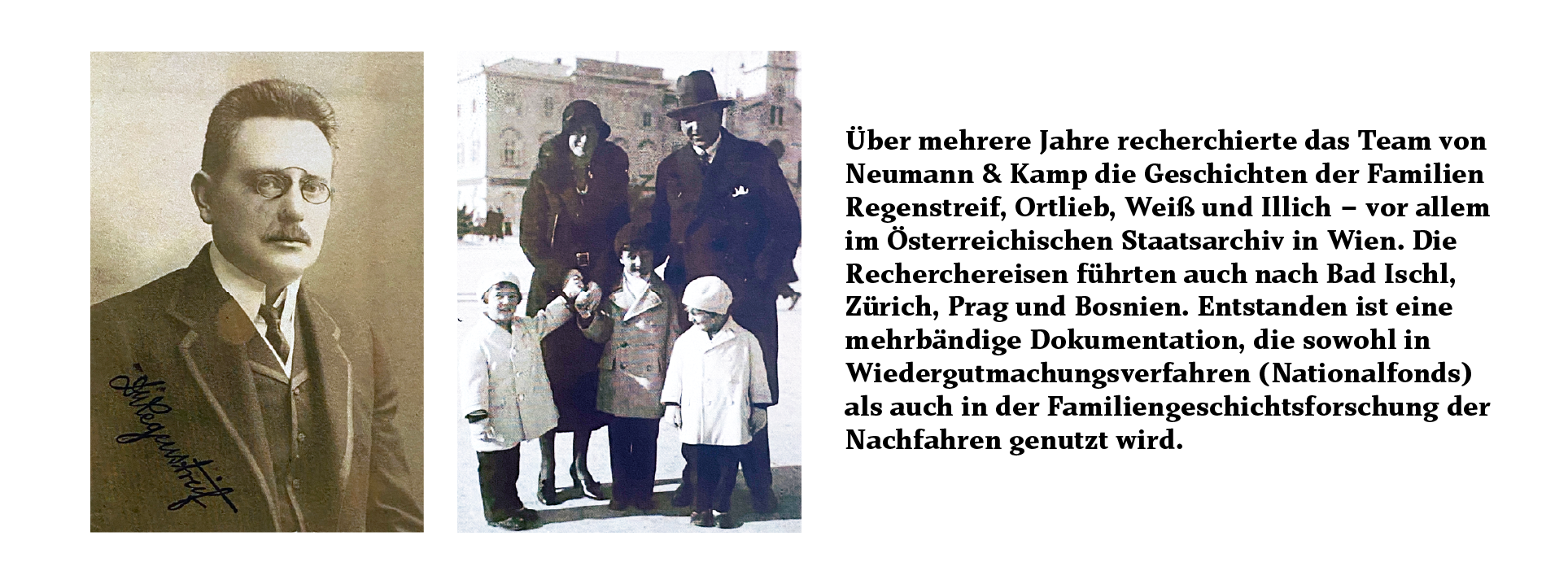 Neumann & Kamp Historische Projekte ist ein Spezialist für Corporate History Publishing, History Marketing und Archivdienstleistungen. 2021 feierten wir unser 20jähriges Firmenjubiläum und können auf die Erfahrung aus über 10.000 Jahren Geschichte(n) für Unternehmen, Institutionen und Privatpersonen zurückgreifen. Seit 2024 sind wir in Österreich mit einer Niederlassung in Salzburg präsent. In Österreich haben wir mehrere Buch- und Rechercheprojekte durchgeführt. Zu unseren Kunden zählen etwa VAMED (Wien), die Vetmeduni Vienna (Wien) und MAN (Gräf & Stift, Österreichische Automobil-Fabriks AG). Zu Wiedergutmachungsfragen recherchierte unser Team mehrere Jahre vor allem im Österreichischen Staatsarchiv in Wien die Geschichten der Familien Regenstreif, Ortlieb, Weiß und Illich aus Wien.